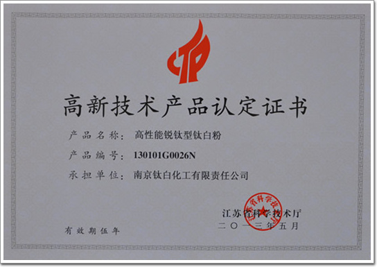 High-tech product certificate (anatase titanium dioxide) |