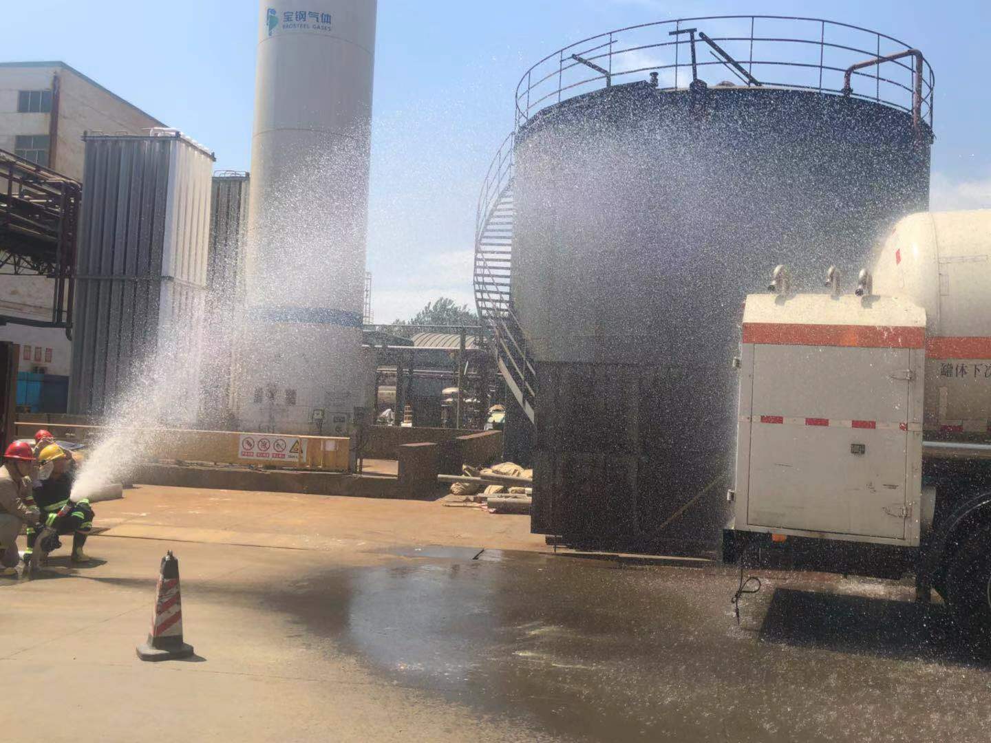 液氧卸料人員因誤操作,導(dǎo)致液氧儲(chǔ)罐閥門損壞、液氧泄漏,押運(yùn)員被凍傷;隨著液氧持續(xù)泄漏、汽化,現(xiàn)場(chǎng)存在氧中毒、火災(zāi)、爆炸等安全風(fēng)險(xiǎn)。公司主要負(fù)責(zé)人接到報(bào)告后立即啟動(dòng)公司級(jí)應(yīng)急救援預(yù)案,全體參加演練的應(yīng)急救援人員分別演練了事故報(bào)告、緊急集合、應(yīng)急搶險(xiǎn)、警戒疏散、醫(yī)療救護(hù)及消防器材使用等應(yīng)急救援科目,演練過(guò)程緊張、有序,各應(yīng)急小組相互協(xié)作,演練基本達(dá)成預(yù)定目標(biāo),取得成功。